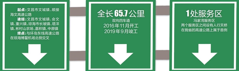 文瓊高速起點位于文昌市文城鎮(zhèn),順接海文高速公路,經(jīng)文昌市文城鎮(zhèn)、會文鎮(zhèn)、重興鎮(zhèn),瓊海市長坡鎮(zhèn)、塔洋鎮(zhèn)、彬村山農(nóng)場、嘉積鎮(zhèn)、中原鎮(zhèn),終點與環(huán)島東線高速公路在瓊海博鰲機場北側(cè)交叉,全長65.7公里。項目于2016年11月開工,它的建成將文昌文城鎮(zhèn)到瓊海博鰲鎮(zhèn)的行車時間從70分鐘縮短至30分鐘。
