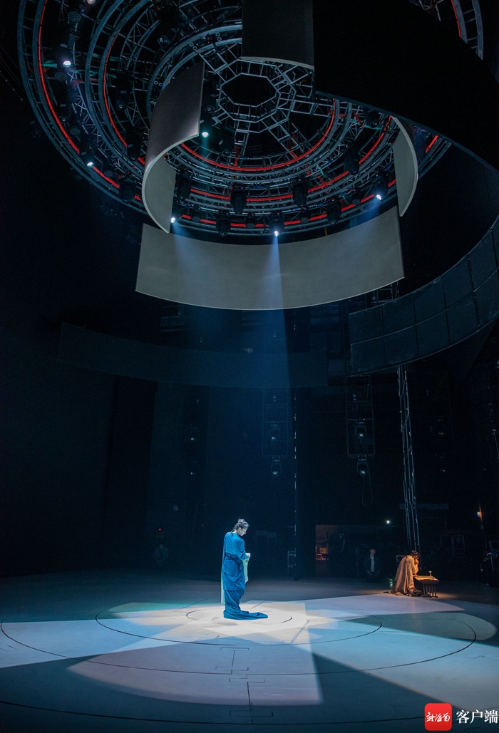 “在3圈同心圓的鋁合金桁架上,由18臺電機(jī)帶動的3塊‘畫卷’弧形板可以自由滑行、升降起落。同時(shí),空中裝置上還安裝了55盞電腦燈,加上裝置自重達(dá)3480公斤,需要12個電動葫蘆吊裝在劇場建筑頂部。”《只此青綠》舞臺監(jiān)督李曉彬說。